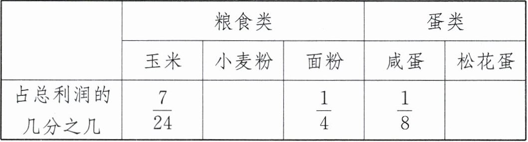 2. 实验班原创 应用意识 近年来,为扩展农民创收渠道、助力乡村振兴,一些驻村干部纷纷开始直播带货。某次农副产品带货直播中,几种粮食类和蛋类产品的销售利润共$\frac{24}{5}$万元,销售情况如下表,粮食类产品的利润占总利润的$\frac{13}{16}$,填写下表,并写出计算过程。