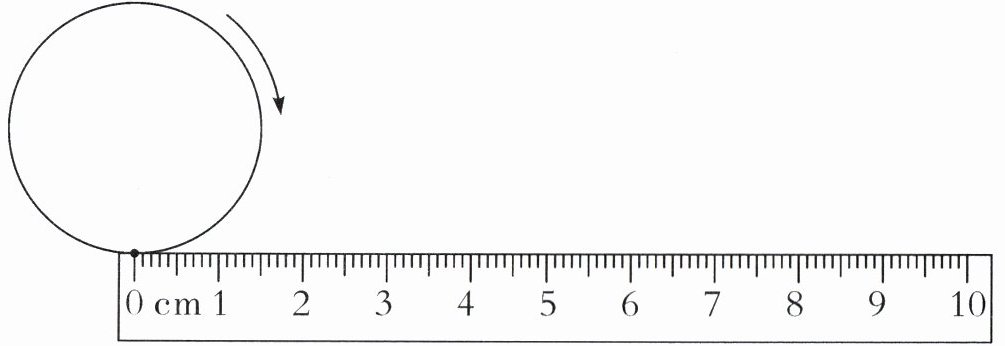 答案:9. $9$ $10$ $9$ 【提示】记号滚动一周的长度就是圆片的周长,圆片的周长为 $1.5×2×3.14 = 9.42$(厘米),因此记号此时停留在刻度 $9$ 厘米和 $10$ 厘米之间,且更接近 $9$ 厘米。