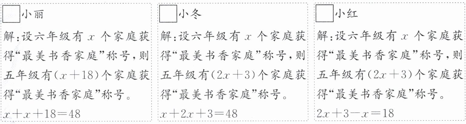 选择合适的信息,算出五年级和六年级分别有多少个家庭获得“最美书香家庭”称号。以下是三名同学选择不同信息列出的方程。