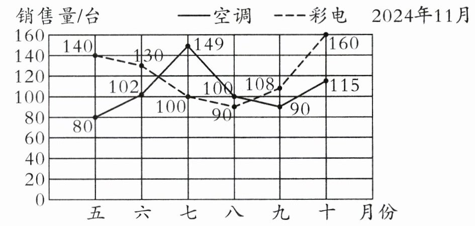 5. 2024 年 9 月开始,江苏省开展家电以旧换新活动。下图是某电器商城 2024 年五月到十月的空调和彩电的销售量统计。看图回答问题。