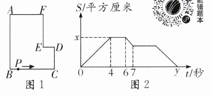 6. 在图1的多边形中有一个点$P$,它以$2$厘米/秒的速度按$B→C→D→E→F→A$的路线运动,形成的三角形$ABP$的面积$S$和时间$t$的关系如图2,且$AB=10$厘米。