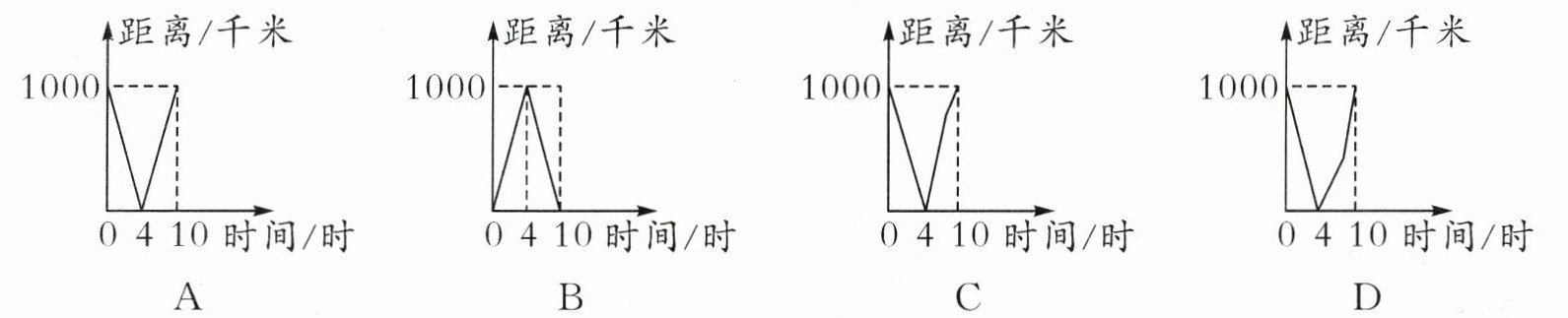 1. 一列慢车从甲地驶往乙地,一列快车从乙地驶往甲地。慢车的速度是100千米/时,快车的速度是150千米/时。甲、乙两地之间的距离是1000千米,两车同时出发。下面四幅图中能正确表示两车之间的距离与快车行驶时间之间关系的是(