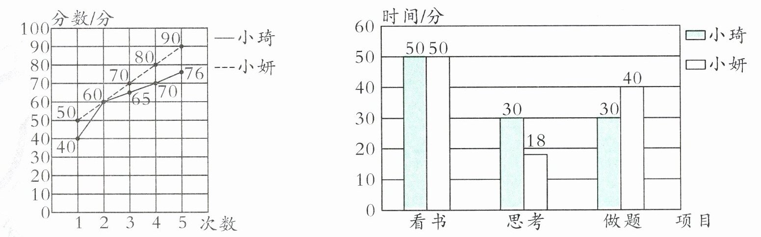 4. 下面两个统计图反映的是小琦、小妍两位同学在复习阶段,数学自测成绩和在家学习时间的分配情况,请看图回答以下问题。