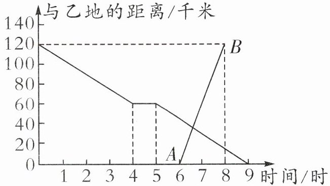 3. 王叔叔骑自行车匀速从甲地驶往乙地,在途中休息了一段时间后,仍按原速行驶,他离乙地的距离与时间的关系如下图折线所示。刘叔叔开车匀速从乙地驶向甲地,比王叔叔晚出发一段时间,他离乙地的距离与时间的关系如下图中线段AB所示。