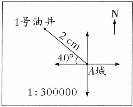 答案:4. C 【提示】以 A 城为观测点,图中 1 号油井在 A 城的北偏西 50°方向上。图上距离是 2cm,比例尺是 1:300000,根据“实际距离=图上距离÷比例尺”,得 2÷$\frac{1}{300000}$=600000(cm),600000cm=6km。