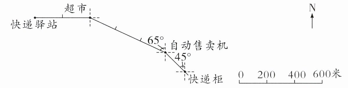 自动售卖机→超市 北偏西 65° 600 米 5 分钟