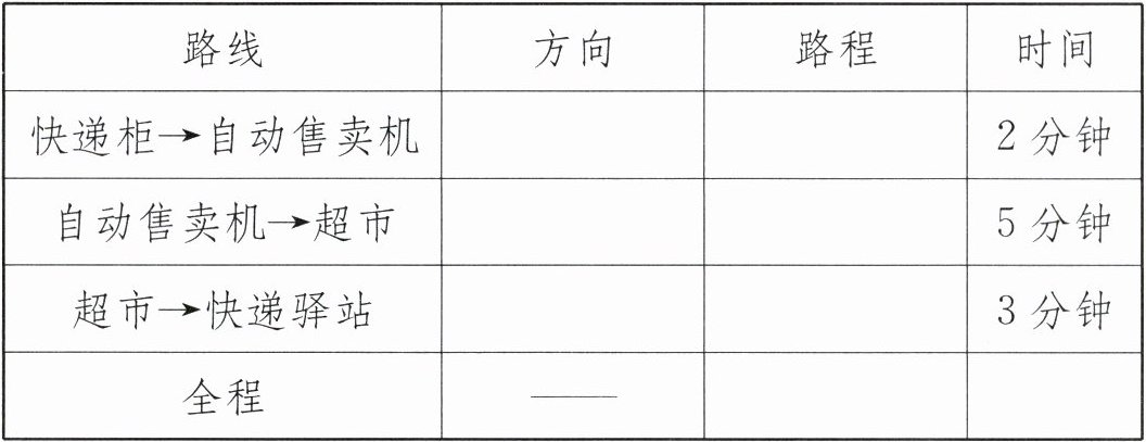 【提示】(1)分别以快递柜、自动售卖机、超市的位置为观测点,即可确定机器人萌宝每次走的方向,根据快递柜到自动售卖机、自动售卖机到超市、超市到快递驿站的图上距离及图中所标注的线段比例尺,即可分别求出各段路程。(2)根据“速度=路程÷时间”,用各段路程之和除以总时间,即可解答。