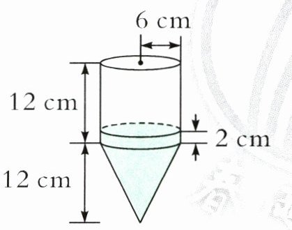 6. 底面半径和高分别是 6 厘米、12 厘米的空心圆锥和空心圆柱各一个,组成竖放的容器(如图)。在这个容器内注入一些细沙,能填满圆锥,还填了部分圆柱,圆柱部分的细沙高 2 厘米。若将这个容器上面封住并倒立,则细沙的高度是(