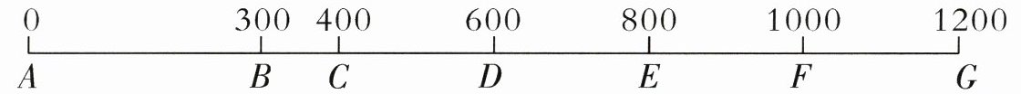 [提示](1)王伯伯从B站上车,到F站下车,要行$1000 - 300 = 700$(千米),全程票价是600元,$600×\frac{700}{1200} = 350$(元)。(2)从D站上车,票价为200元,乘车里程数为$200÷600×1200 = 400$(千米),D站到F站是400千米,所以赵伯伯的目的地是F站。