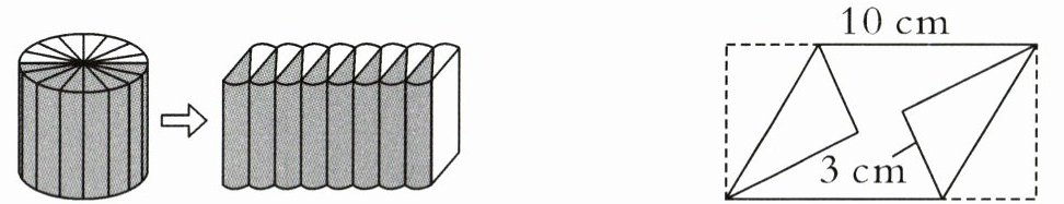 9. 把一个底面直径为6厘米、高为10厘米的圆柱切成若干份,拼成近似的长方体(如左下图)。这个长方体的表面积比圆柱增加了(