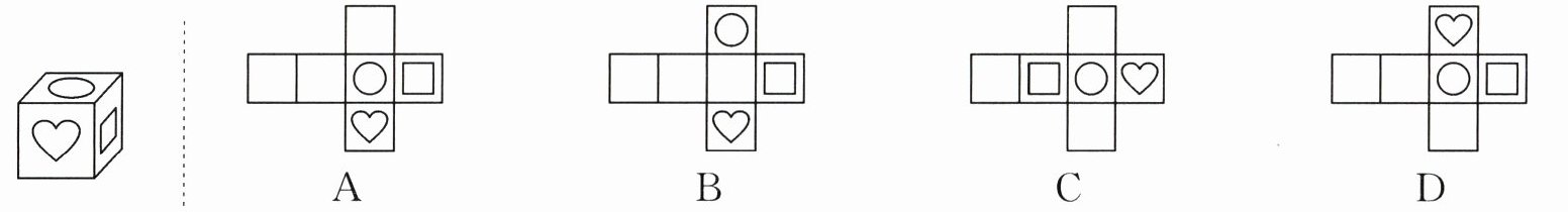 [提示]根据题意可得,心形图案与圆形图案相邻,并且心形图案的上方与圆形图案相邻,心形图案与正方形图案相邻,据此与正方体展开图逐一对比,选择正确答案。
