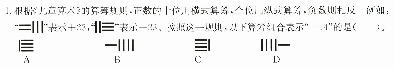 根据算筹表示规则:正数由“汉字数字(十位)+竖线(个位)”组成,负数由“竖线(十位)+横线(个位)”组成,且十位在左、个位在右。