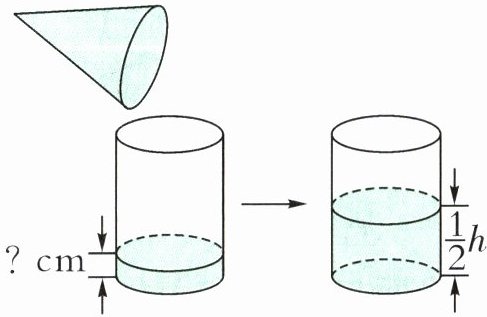 5. 下图中,圆柱形容器和圆锥形容器等底等高。圆柱形容器中原来装有一些水,现在将圆锥形容器装满水,然后全部倒入圆柱形容器中,这时圆柱形容器中水的高度是12厘米,刚好是圆柱形容器高度的$$\frac{1}{2}$$。圆柱形容器中原来水的高度是(