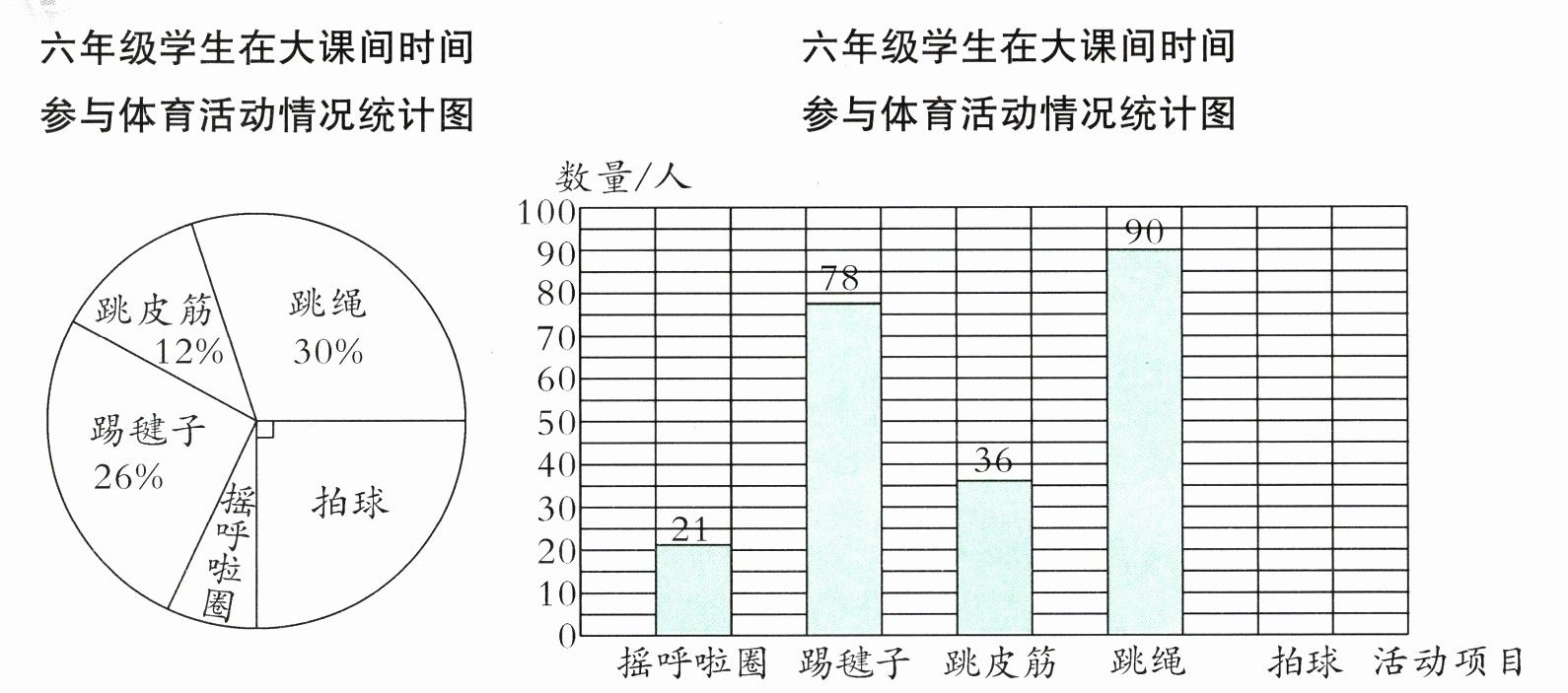 2. 为落实江苏省教育厅“2·15”专项行动,学校在大课间时间组织学生开展丰富多彩的体育活动。张老师统计了六年级学生在大课间时间参与体育活动的情况,并绘制了两幅统计图(如下图),请根据图中信息回答问题。