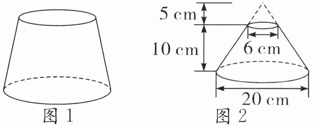 3. 灯罩是一种可以用来遮挡光线的器具,而图1这样的灯罩能够更好地向下聚集光线,使得光线更加柔和。手工课上,梦梦用麻布制作了一个类似形状的灯罩,数据如图2所示,这个灯罩的内部空间大约是多少立方厘米?(灯罩的厚度忽略不计,π取3)