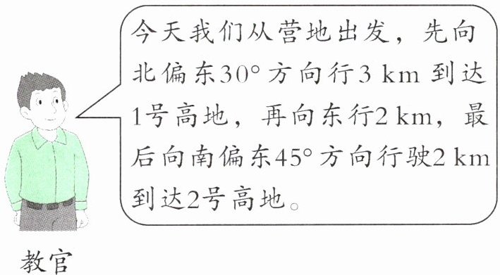 答案:2.从营地出发按北偏东$30^{\circ}$方向画射线,在射线上取每厘米代表1千米的3厘米处标为1号高地;从1号高地出发向东画2厘米线段;从线段终点按南偏东$45^{\circ}$方向画射线,在射线上取2厘米处标为2号高地。