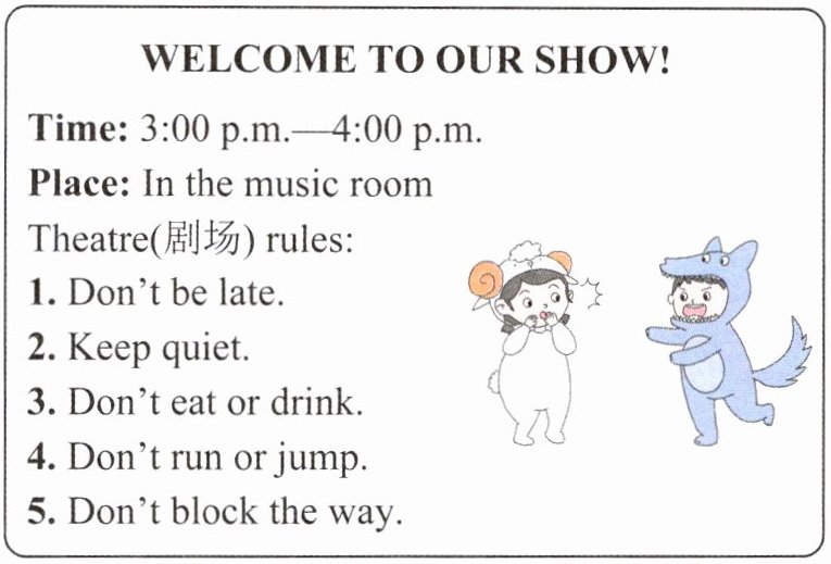 2.F 解析:根据海报中“Time: 3:00 p.m. — 4:00 p.m.”和Theatre rules下面的“Don't be late.”可知,演出时间为下午3点开始,持续到4点,不可以迟到。故填F。
