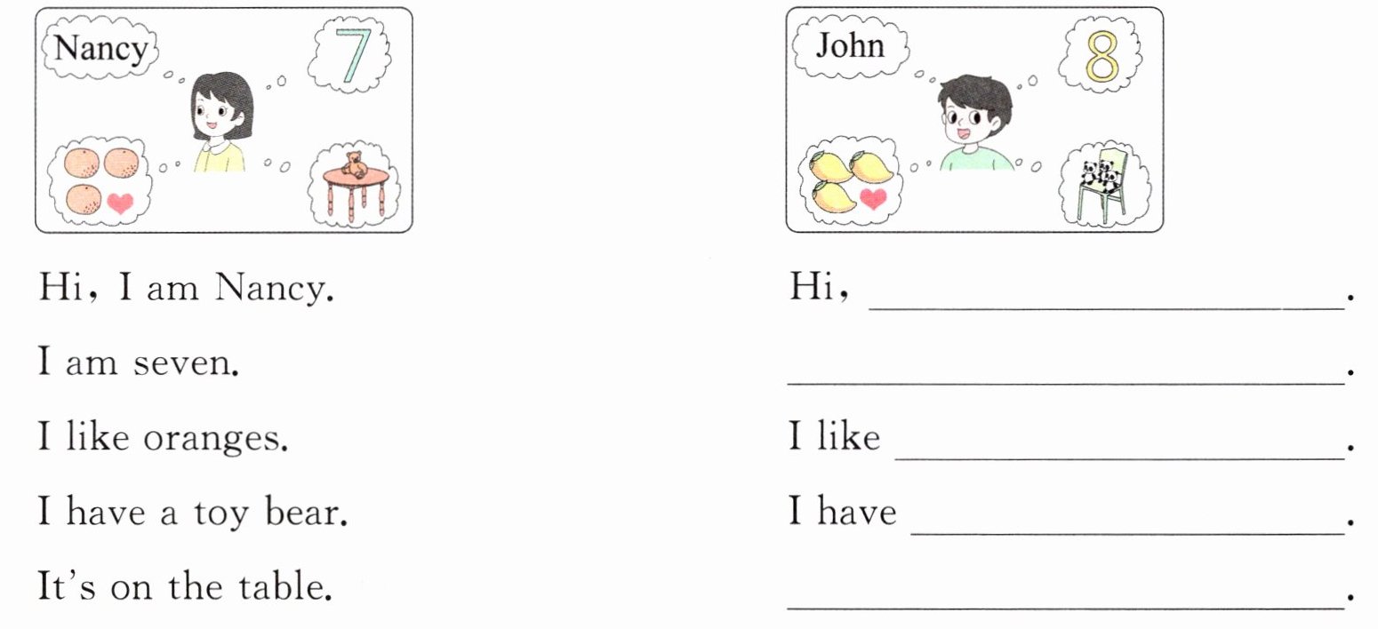 答案:I am John, I am eight, mangoes, three toy pandas, They're on the chair