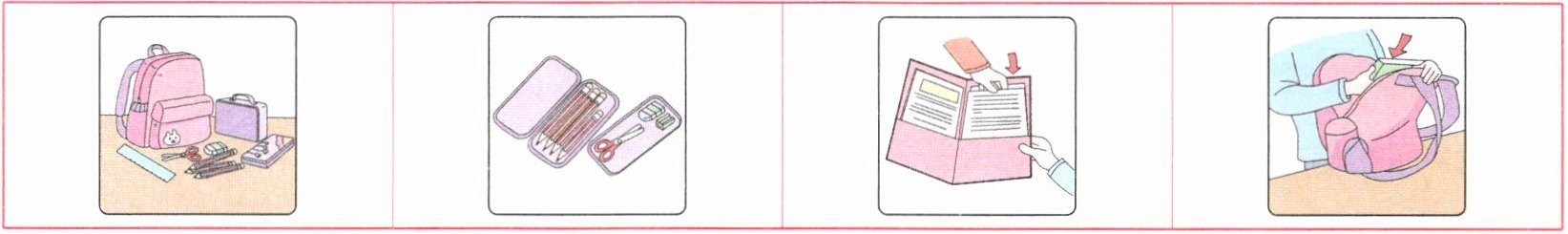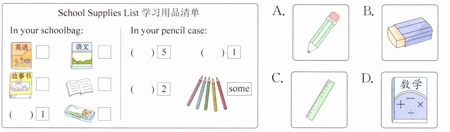 ★ In the schoolbag, you'd better (应该) have: a Maths book, a Chinese book, an English book, two storybooks (故事书), three notebooks (笔记本) and a pencil case.