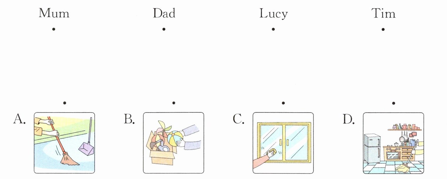 Mum cleans the windows with a sponge(海绵). Dad uses a broom to sweep the dusty(布满灰尘的) floor. Lucy, the older sister, mops the kitchen tiles(瓷砖) with water. Her brother Tim puts away his toys and puts old books into a closet(储藏室).