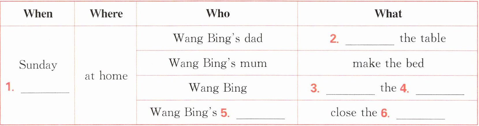 根据三年级下册英语所学内容,结合听力中关于周日家庭活动的描述,填写表格信息。1. 时间为上午,填"morning";2. 爸爸擦桌子,填"clean";3. 王兵扫地,填"sweep";4. 扫地的对象是"floor";5. 王兵的妹妹/姐姐关窗户,填"sister";6. 关的是"window"。