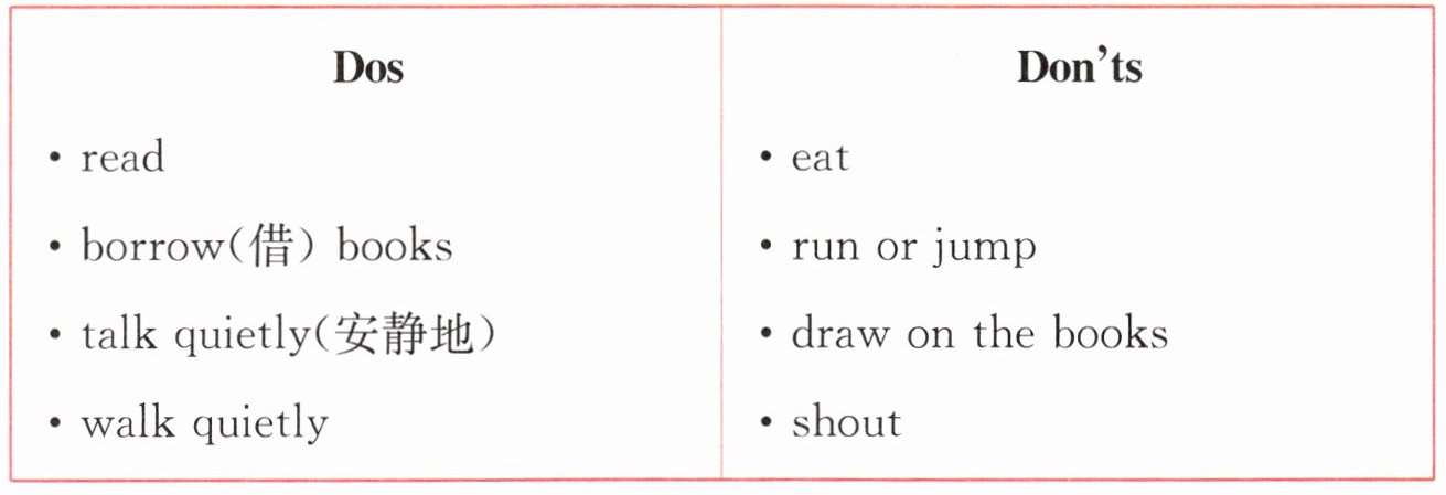 Hello! I'm Nancy. There is a library in our school. It's not big but nice. I often(经常) go there with my friend Mary in the afternoon. We have a good time there. There are some “Dos” and “Don'ts” in the library. Let's have a look and we should follow the rules.