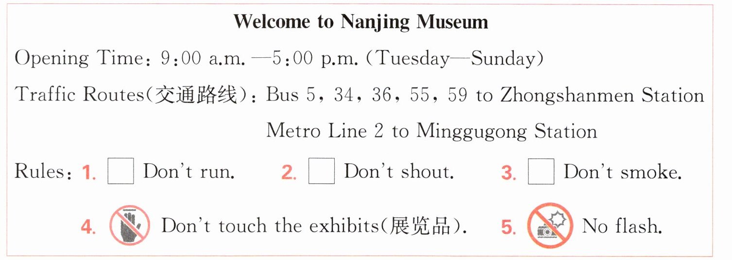 3. 我们不能在博物馆里奔跑、喧哗、吸烟或触摸展品。
