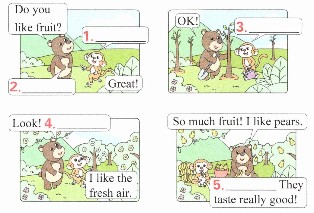 答案:五、1. Make 2. Taste 3. salad 4. apple 5. mangoes 6. fruit 7. bowl