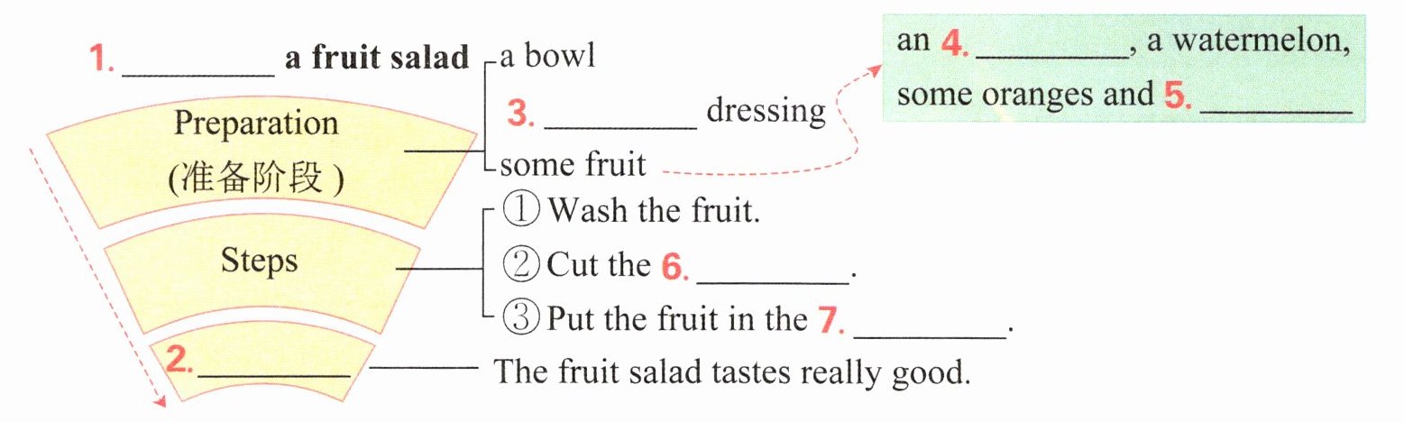 五、Su Yang 和 Su Hai 准备制作水果沙拉。根据短文内容,补全水果沙拉的制作步骤。