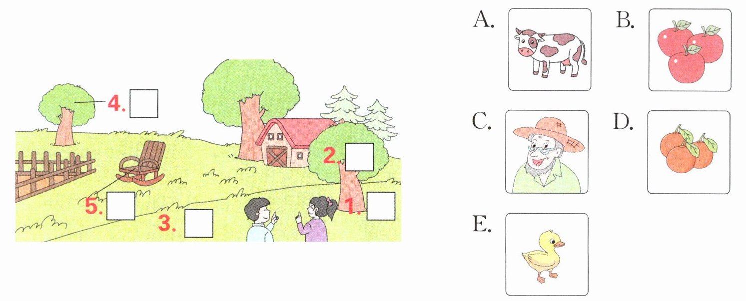 七、听录音,将下列人或物放入图中合适的位置。(听两遍)