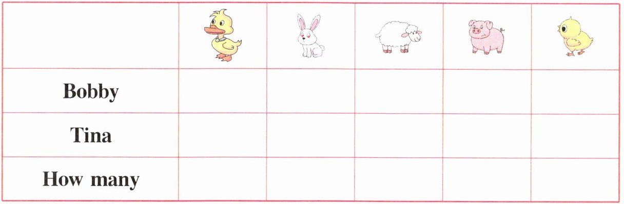 六、听录音,在 Bobby 和 Tina 看到的动物下画“√”并写下数量。(听两遍)