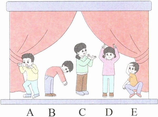 1. 图A男孩做奔跑状,对应老虎跑,选A;2. 图C女孩拍手像唱歌,对应鸟唱歌,选C;3. 图E男孩蹲坐像猴子,选E;4. 图D女孩举手像兔子耳朵,选D;5. 图B男孩弯腰像大象,选B。