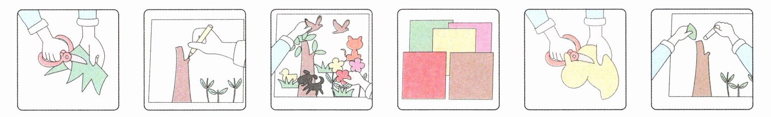 我的名字叫图图。我有一些彩色的纸。我可以用它做一个花园。首先,把绿色的纸剪成叶子和草。然后从黄色、红色和粉色的纸上剪出一些花。接着,剪出一些黄色的鸭子和一些棕色的鸟。再剪出一只黑色的狗和一只橙色的猫。下一步,在纸上画一个棕色的树干和一些绿色的茎。最后,粘贴叶子和花。也粘贴草和动物。看!这是我美丽的花园。