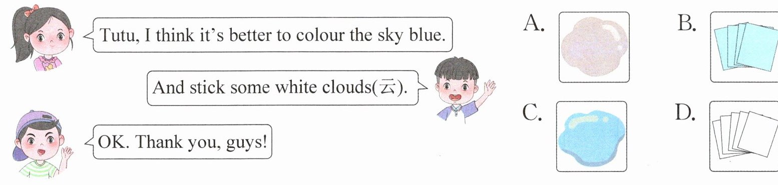 (二) C, D 解析·根据 Diandian 说的“I think it's better to colour the sky blue”和 Liangliang 说的“stick some white clouds”可知,Tutu 还需要准备蓝色颜料和白色卡纸。故选 C, D。