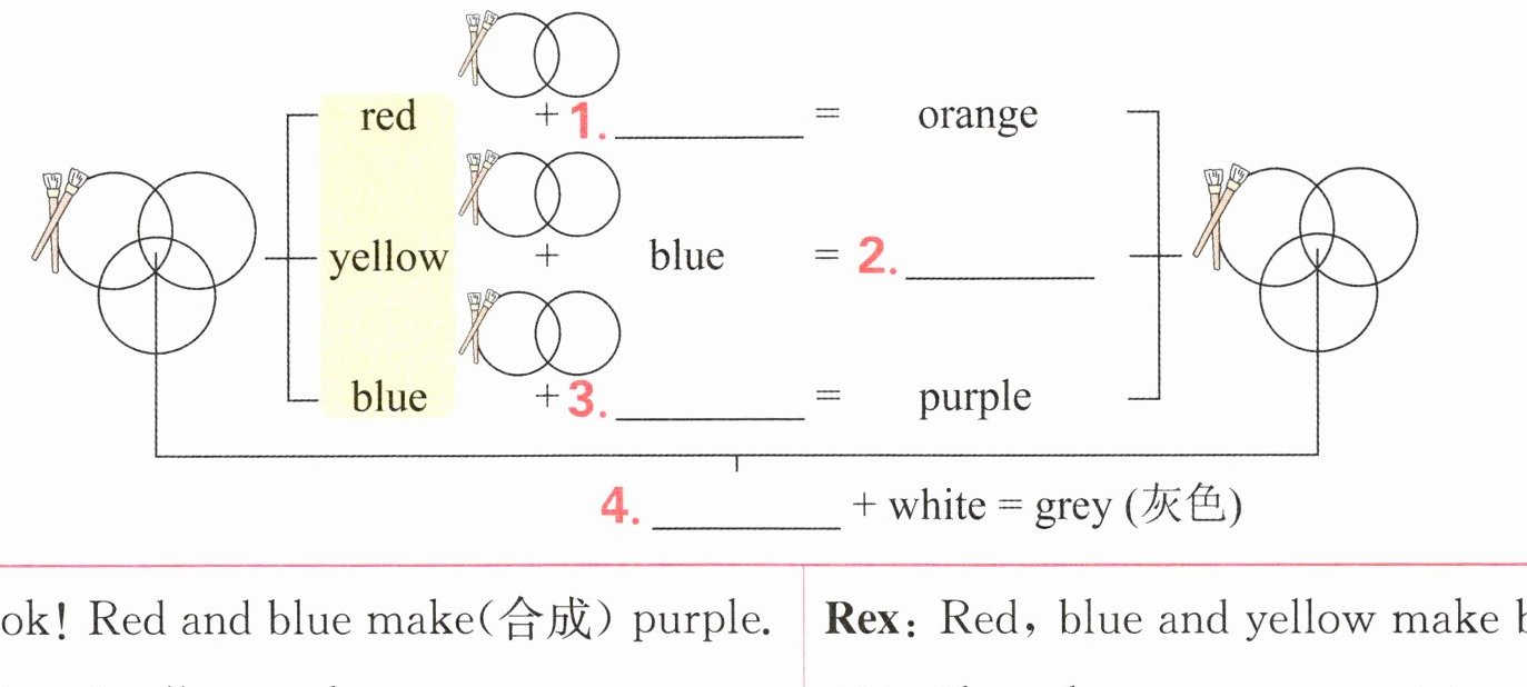 识,将对应的调色盘涂色,并填写正确的颜色单词。