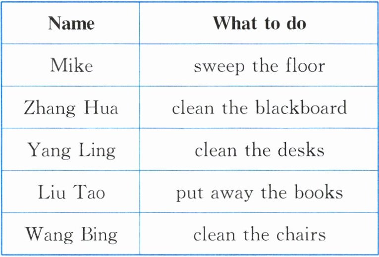 答案:示例: Let's clean our classroom. Mike, please sweep the floor. Zhang Hua, clean the blackboard, please. Yang Ling, please clean the desks. Liu Tao, please put away the books. Wang Bing, please clean the chairs.