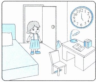 时钟在墙上。现在是五点钟。书和一盏台灯在书桌上。她想要找到铅笔。“我的铅笔在哪里?”她说。铅笔在椅子下面。她还想要找到球。“球在哪里?”她问道。球在门后面。