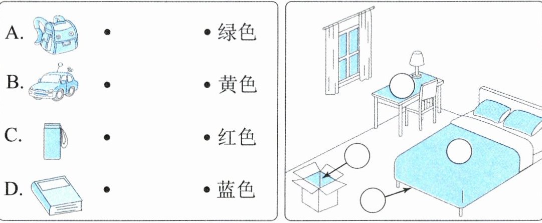 四(2025·苏州常熟市期末)听录音,将相关联的物品和颜色连线,再确定物品在房间中的位置,将序号填在圆圈内。(听两遍,12分)