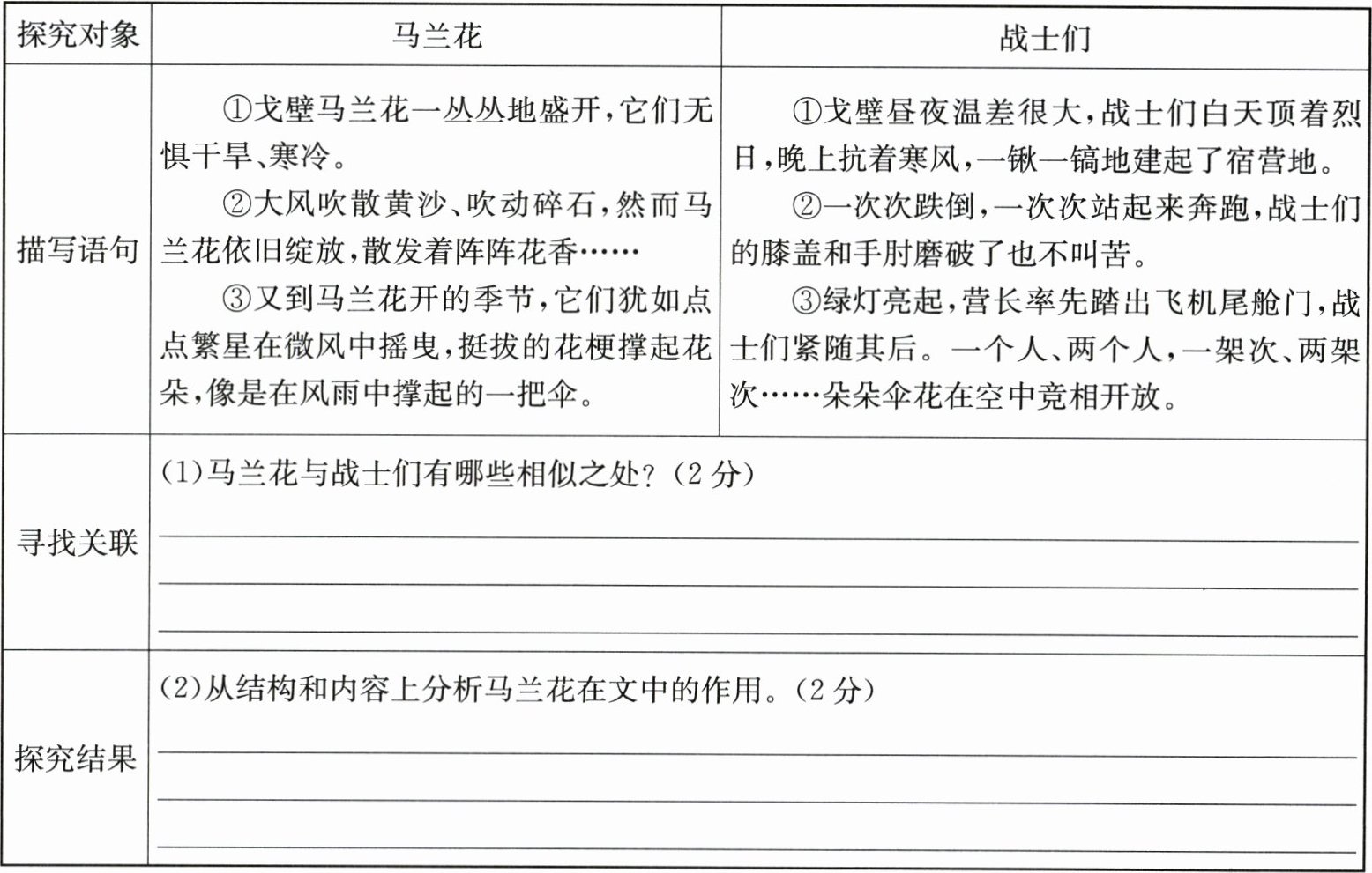 ⑦马兰花在贫瘠且风沙肆虐的戈壁滩上散发芬芳,战士们也在艰难困苦中扎下根来,用黄沙打磨自己的锋芒。