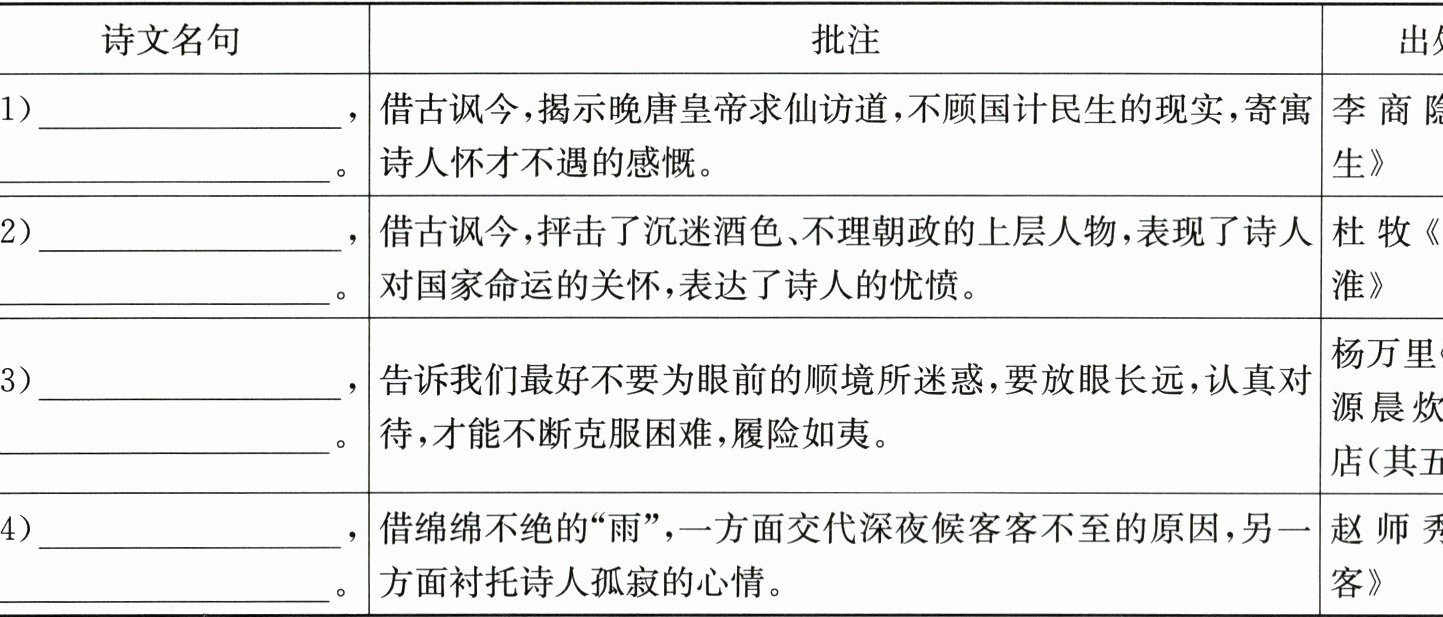 答案:1. (1) 可怜夜半虚前席 不问苍生问鬼神 (2) 商女不知亡国恨 隔江犹唱后庭花 (3) 政入万山围子里 一山放出一山拦 (4) 黄梅时节家家雨 青草池塘处处蛙