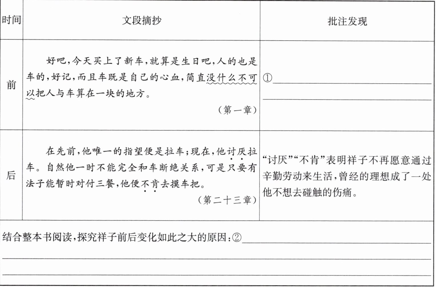 2. 小语在完成“祥子之变”专题探究时,选取了祥子前后变化的语段,并做了批注,请帮他一起完成。