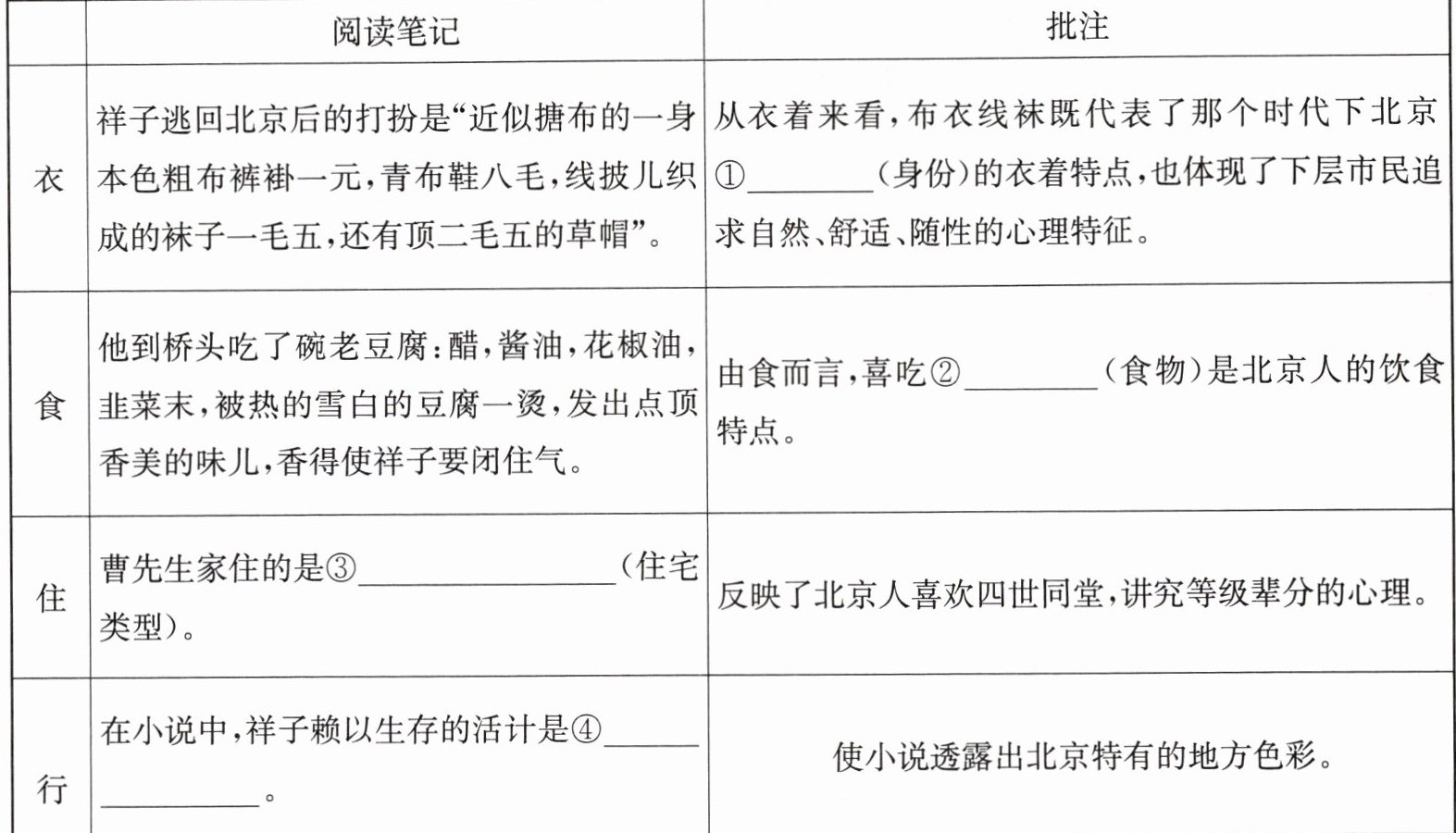 1. 老舍先生在《骆驼祥子》中为我们展现了一幅幅北京风俗人情图画。小语在阅读过程中从人物的衣食住行方面做了如下批注,请你结合名著内容,帮他补充完整。