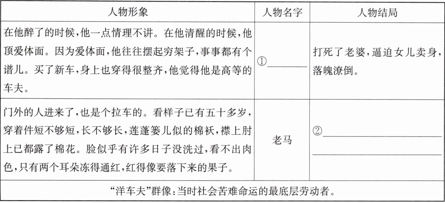 1. 班级在探究《骆驼祥子》中“洋车夫”专题,请你完成表格。