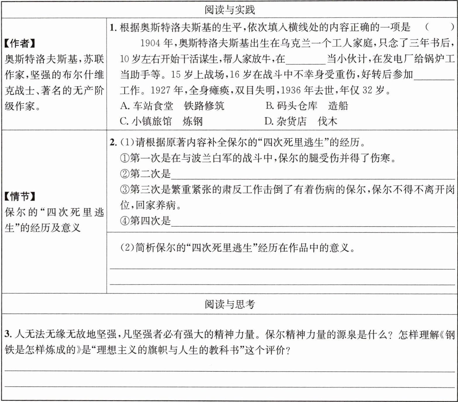 答案:三、1.A【点拨】本题考查对名著作者的掌握情况。奥斯特洛夫斯基是《钢铁是怎样炼成的》主人公保尔的原型,他的经历与保尔基本类似,童年时也曾在车站食堂当小伙计,受重伤好转后也到工地参加过铁路修筑工作。