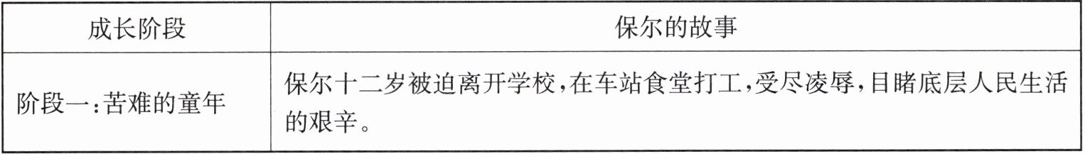 1. 读完《钢铁是怎样炼成的》后,请你填写表格,梳理保尔的故事。