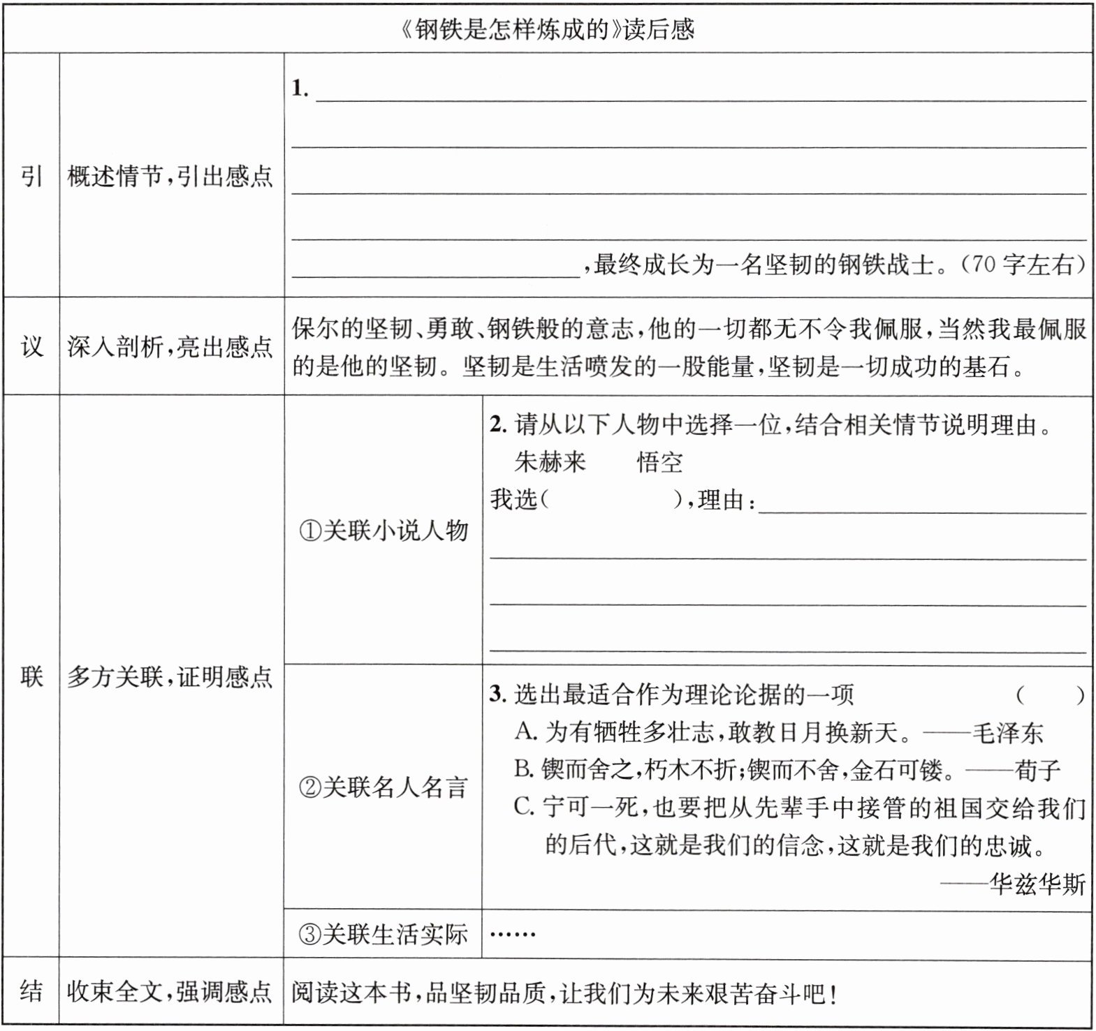 七、小文阅读《钢铁是怎样炼成的》后被主人公的坚韧打动,决定以此为切入点写一篇读后感。请根据你的阅读体验帮她一起拟写读后提纲。
