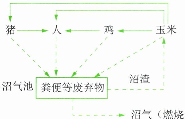 6. 右图是某农业生态系统的食物网。在该食物网中,人们合理利用自然资源,将鸡、猪、人的粪便以及玉米秸秆放入沼气池发酵,产生的沼气用于照明和做饭,沼渣用来做肥料,从而建立了一种多层次、多功能的生态农业系统。请据图分析回答下列问题。