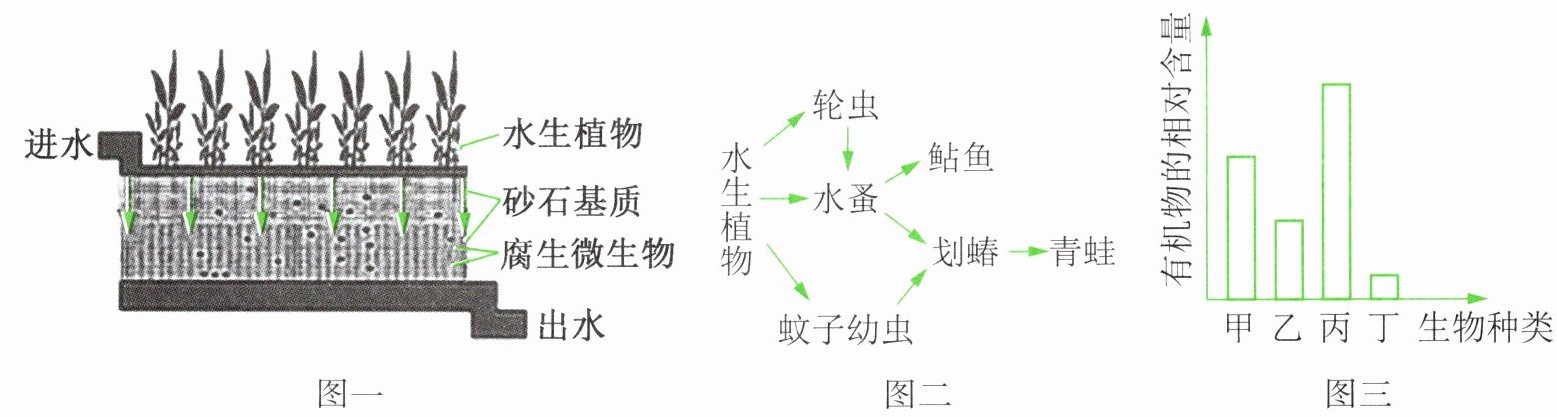 7. 2024 年 2 月 2 日,第 28 个“世界湿地日”主题宣传活动在济西国家湿地公园举行,旨在呼吁全社会参与湿地保护修复。下图一为人工湿地进行污水净化的示意图,图二为该生态系统中的部分生物构成的食物网,图三表示图二某条食物链中四种生物体内有机物的相对含量。请据图回答下列问题。