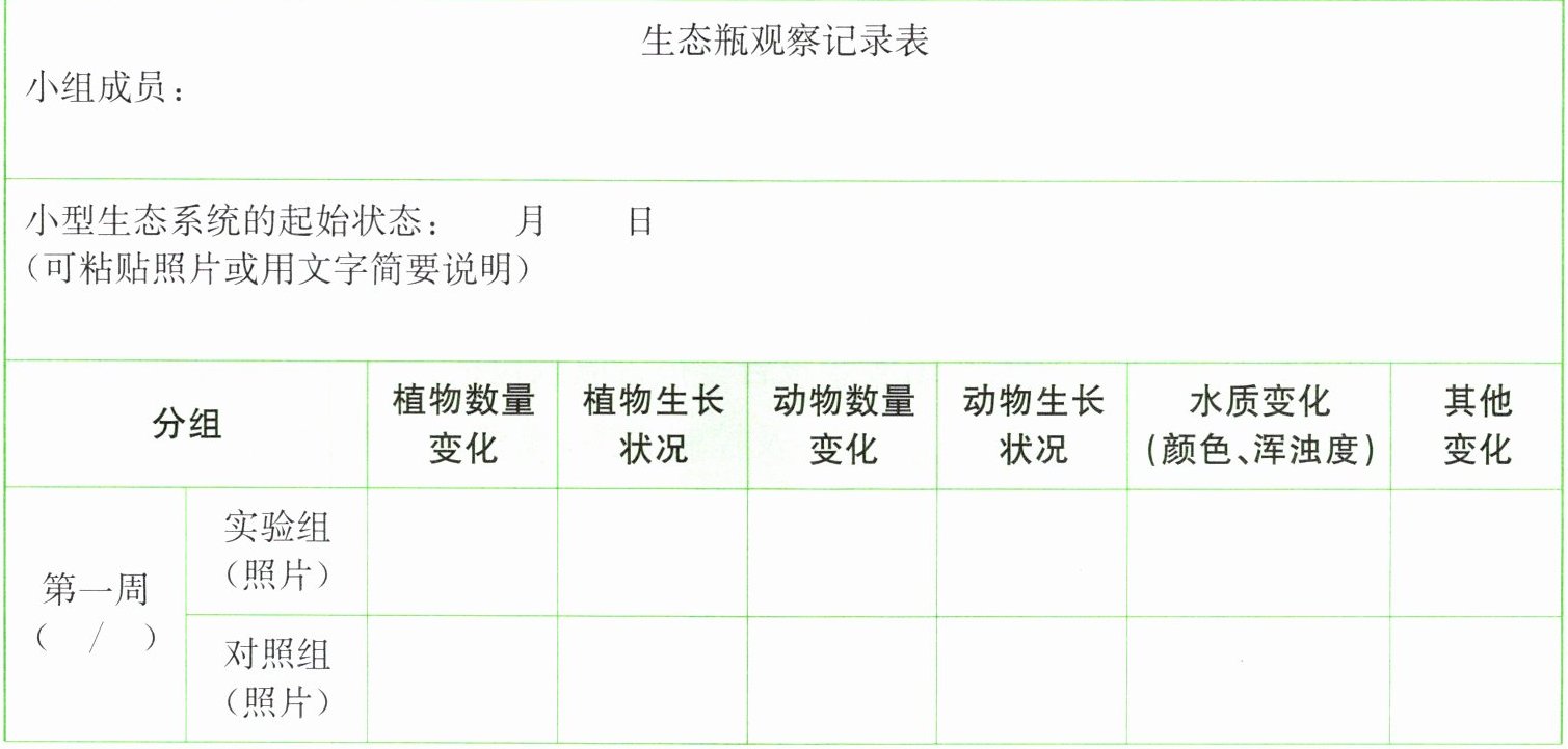 及控制方法、观察记录表、能在一段时间维持平衡的生态瓶照片及反思等。