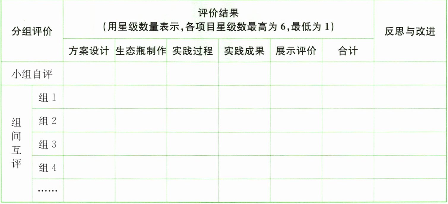 3. 认真听取其他小组的汇报,依据“实践评价量表”,从方案设计、生态瓶制作、实践过程、实践成果、展示评价等方面进行小组自评和组间互评,并记录在下面的表格中。